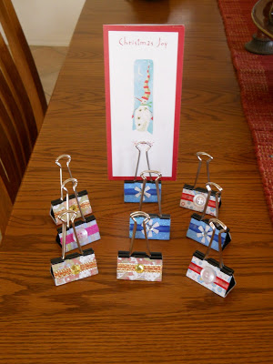 You just cut the ribbon/paper to fit the binder clip and use rubber cement to glue them on. Then, use a paper clip to secure it in place while it dries. Voila! Super adorable Christmas card stands.