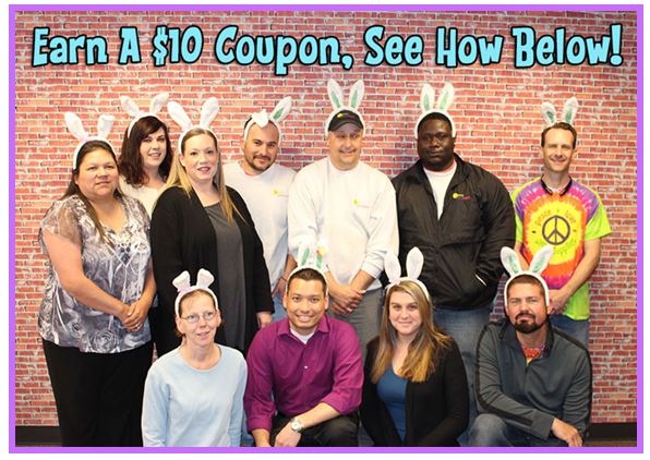 easterWith the order you receive on Good Friday, ask to take a picture with your SunDANCE Driver in his bunny ears and send it to your DANCE Partner to post on our SunDANCE Facebook page! You do that and we’ll email you a $10 off coupon good till the end of May! Pictures have to be received by Monday, April 21st to qualify for the coupon.