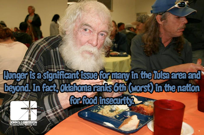 John 3:16 Mission strives to meet the physical, spiritual, and emotional needs of homeless and at-risk men, women, children, and families of the Tulsa area. The need for this type of service in Oklahoma is urgent. An estimated 44,000 children in Oklahoma are homeless. Nearly a quarter of Oklahoma’s children live in poverty. One in six Tulsans face food insecurity on a daily basis.